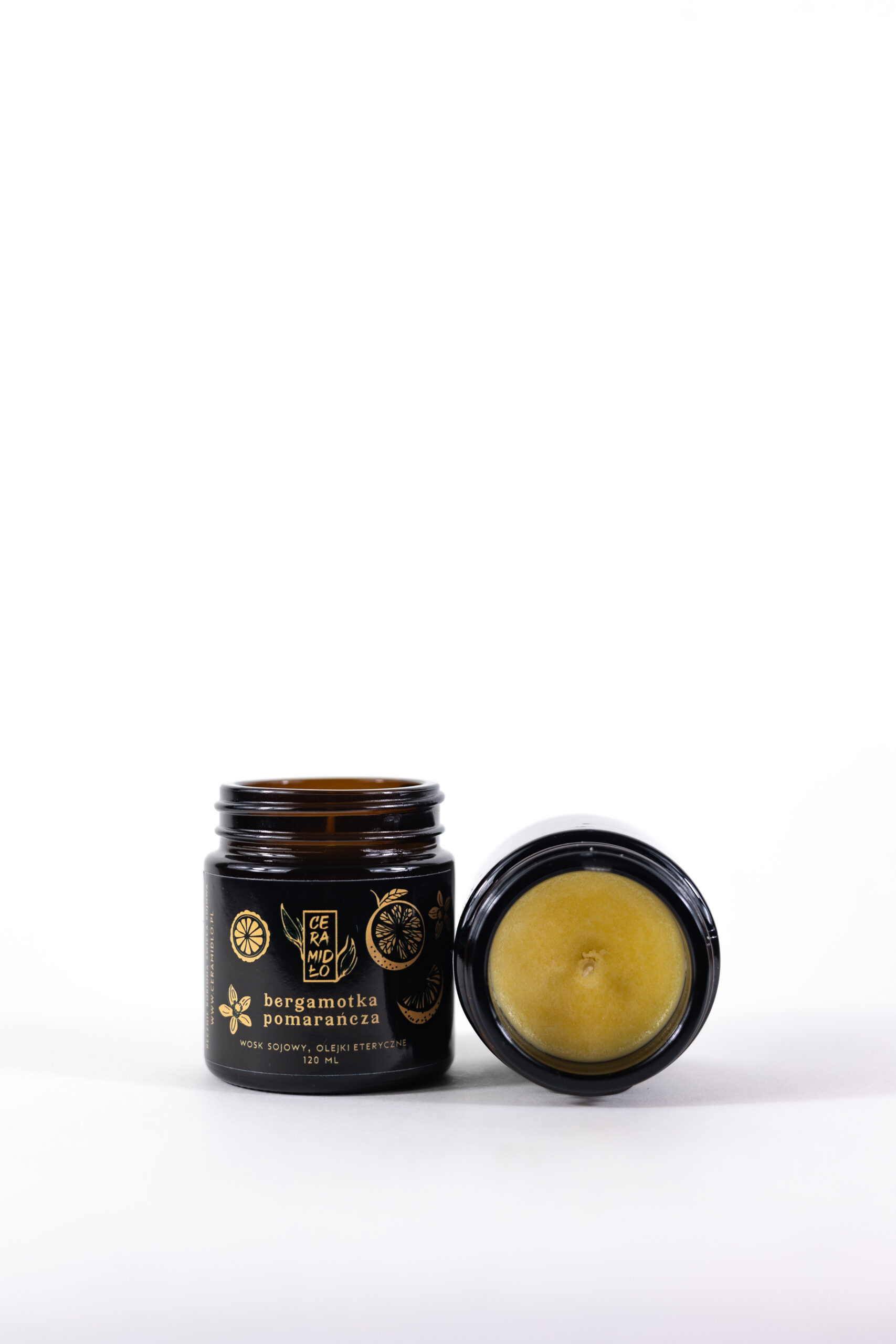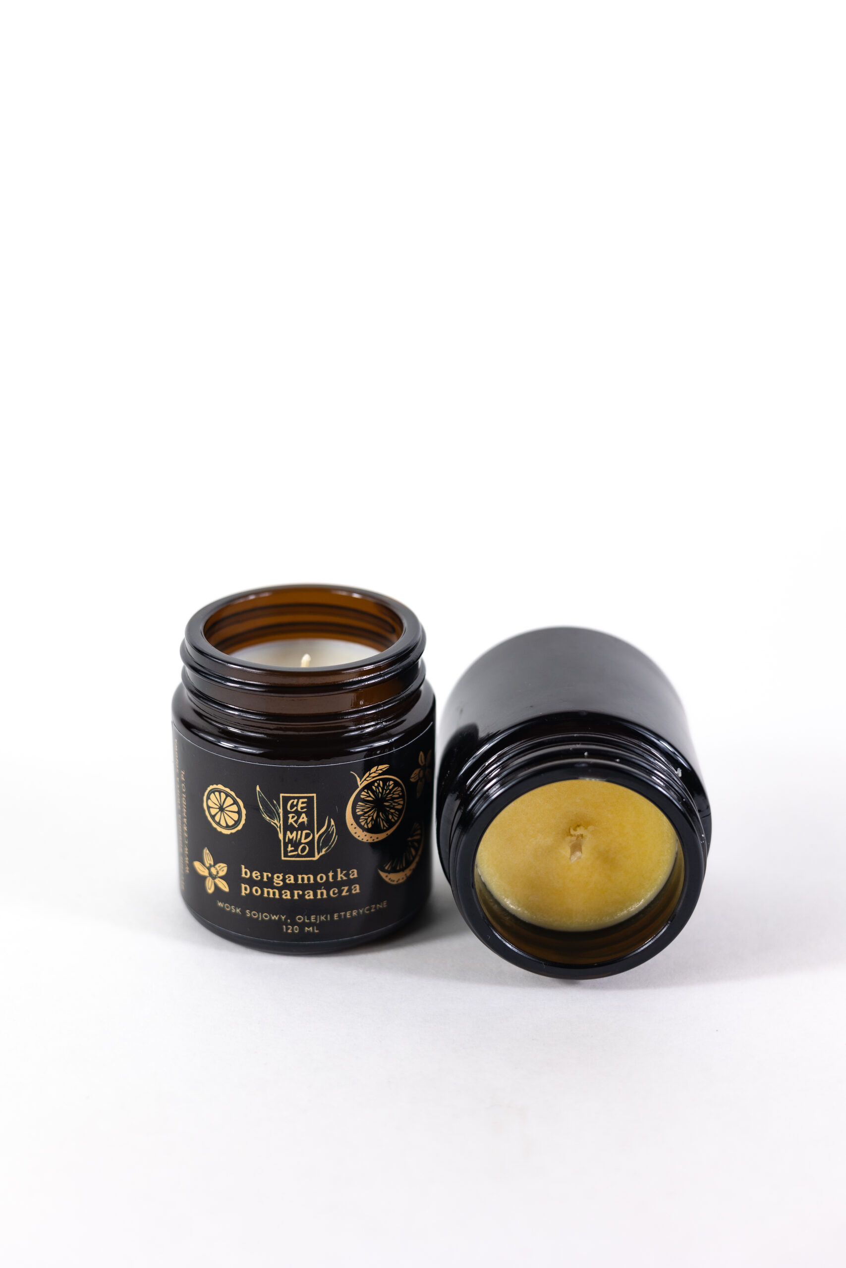 Ręcznie robiona świeca z wosku sojowego i olejków eterycznych z bergamotki i słodkiej pomarańczy, w słoiczku z ciemnego szkła z plastikową zakrętką.