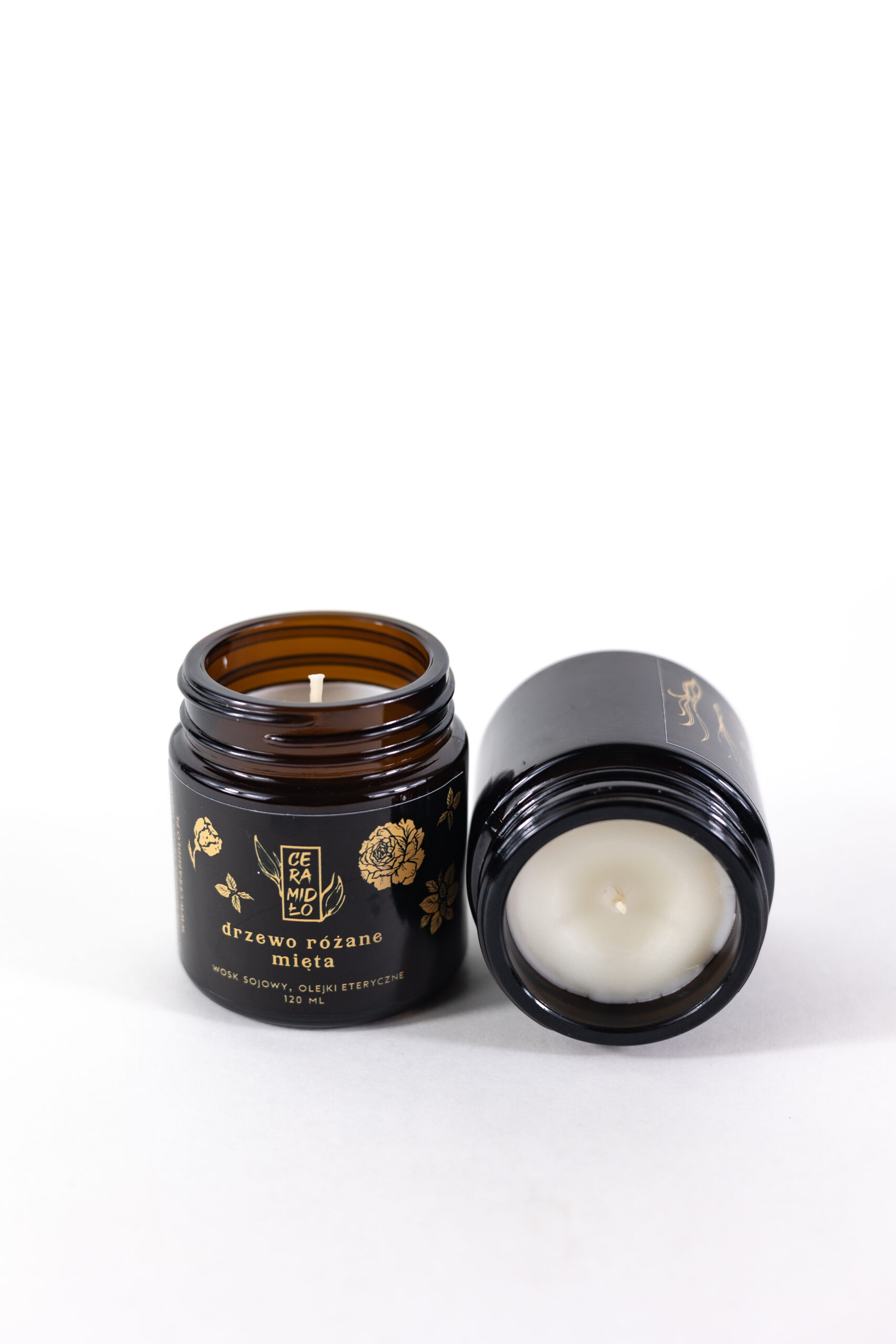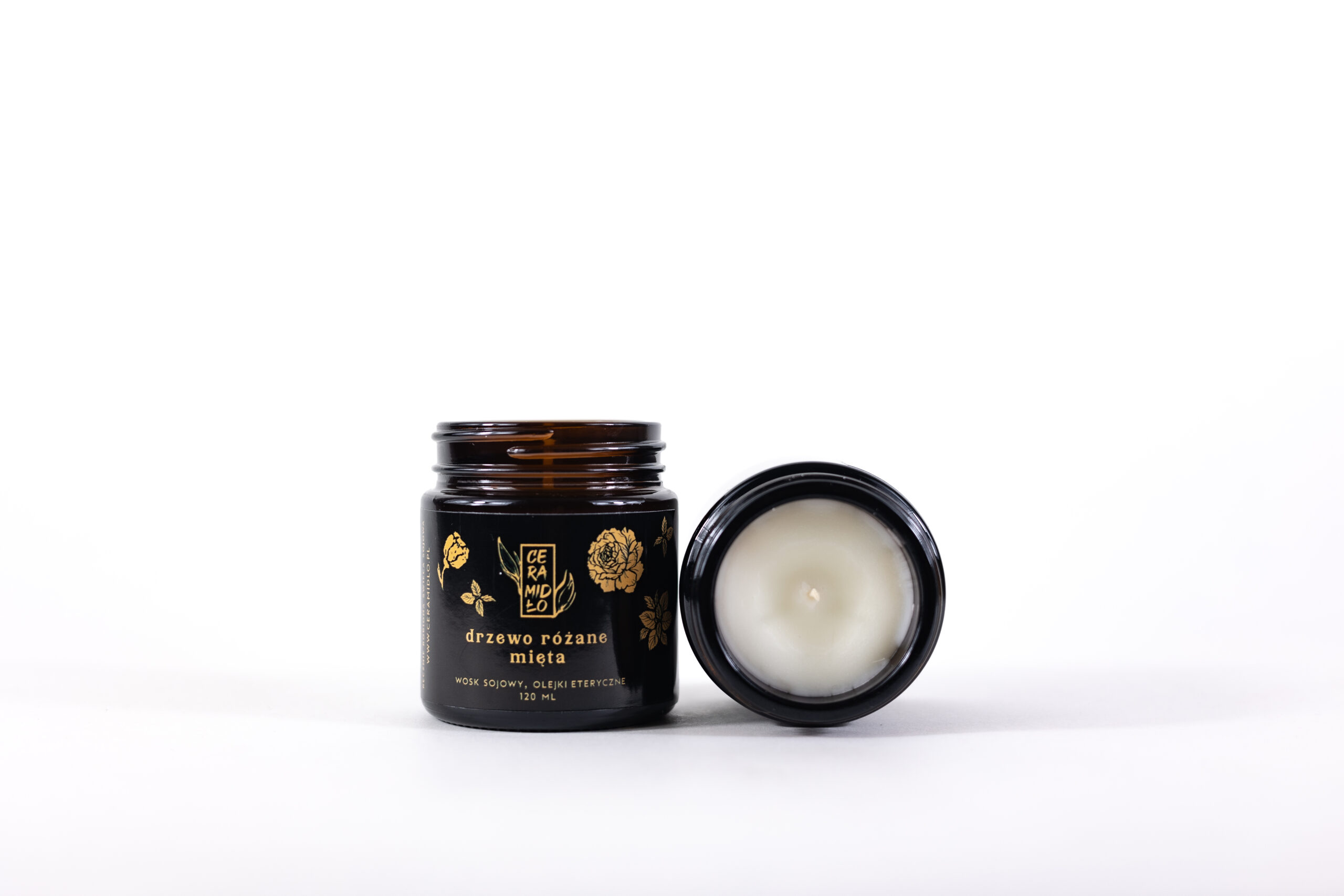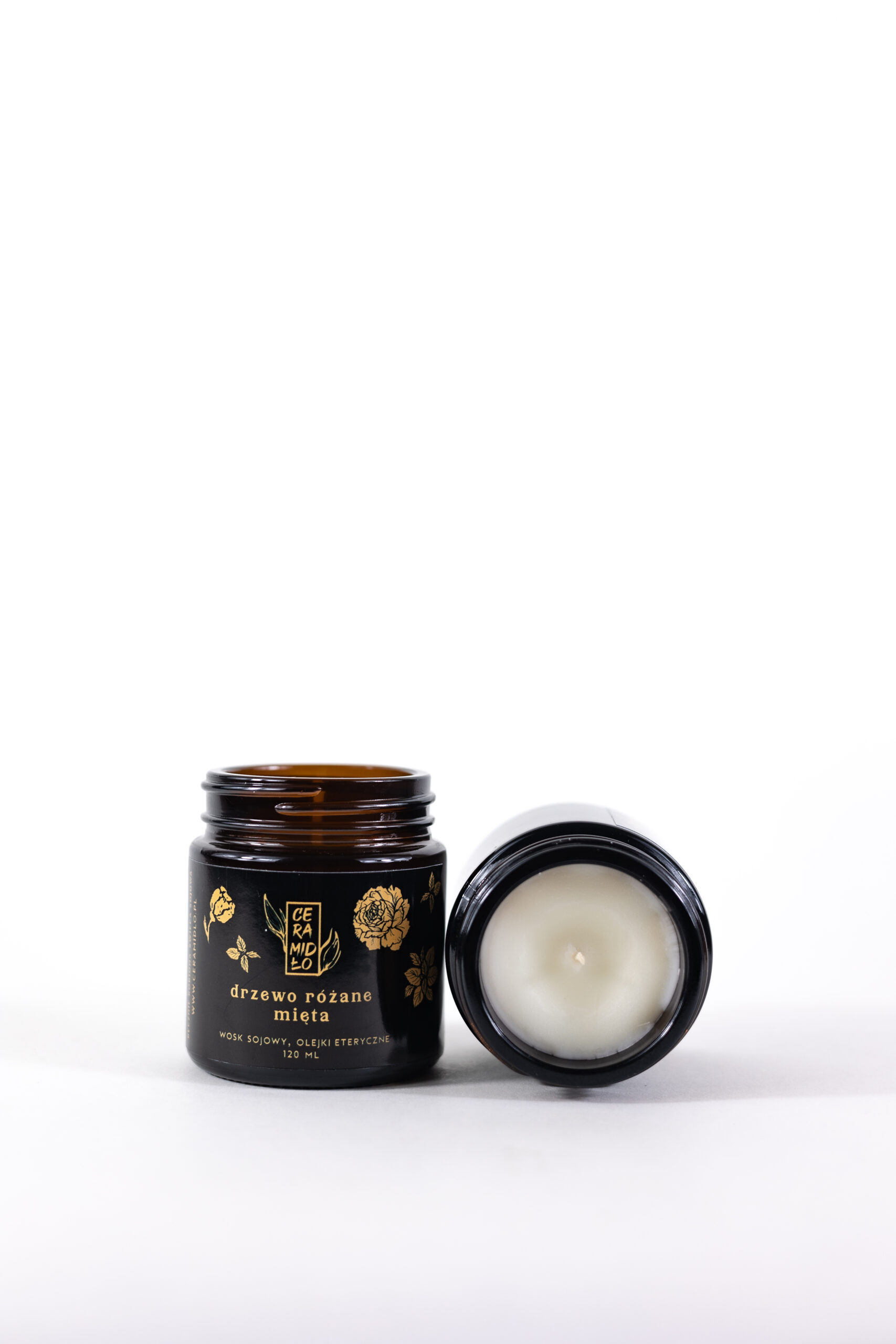 Ręcznie robiona świeca z wosku sojowego i olejków eterycznych: miętowego i z drzewa różanego, w słoiczku z ciemnego szkła z plastikową zakrętką.
