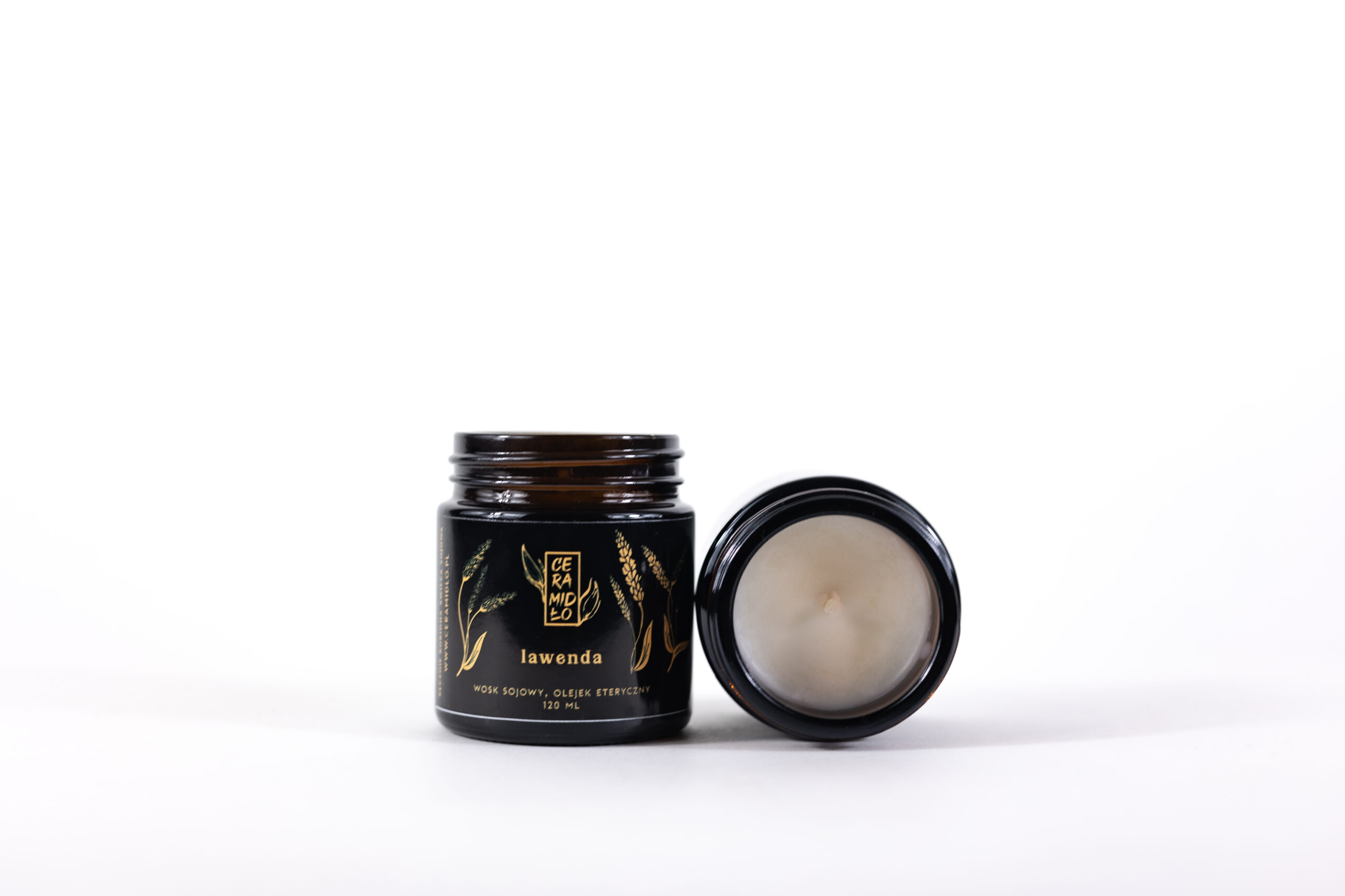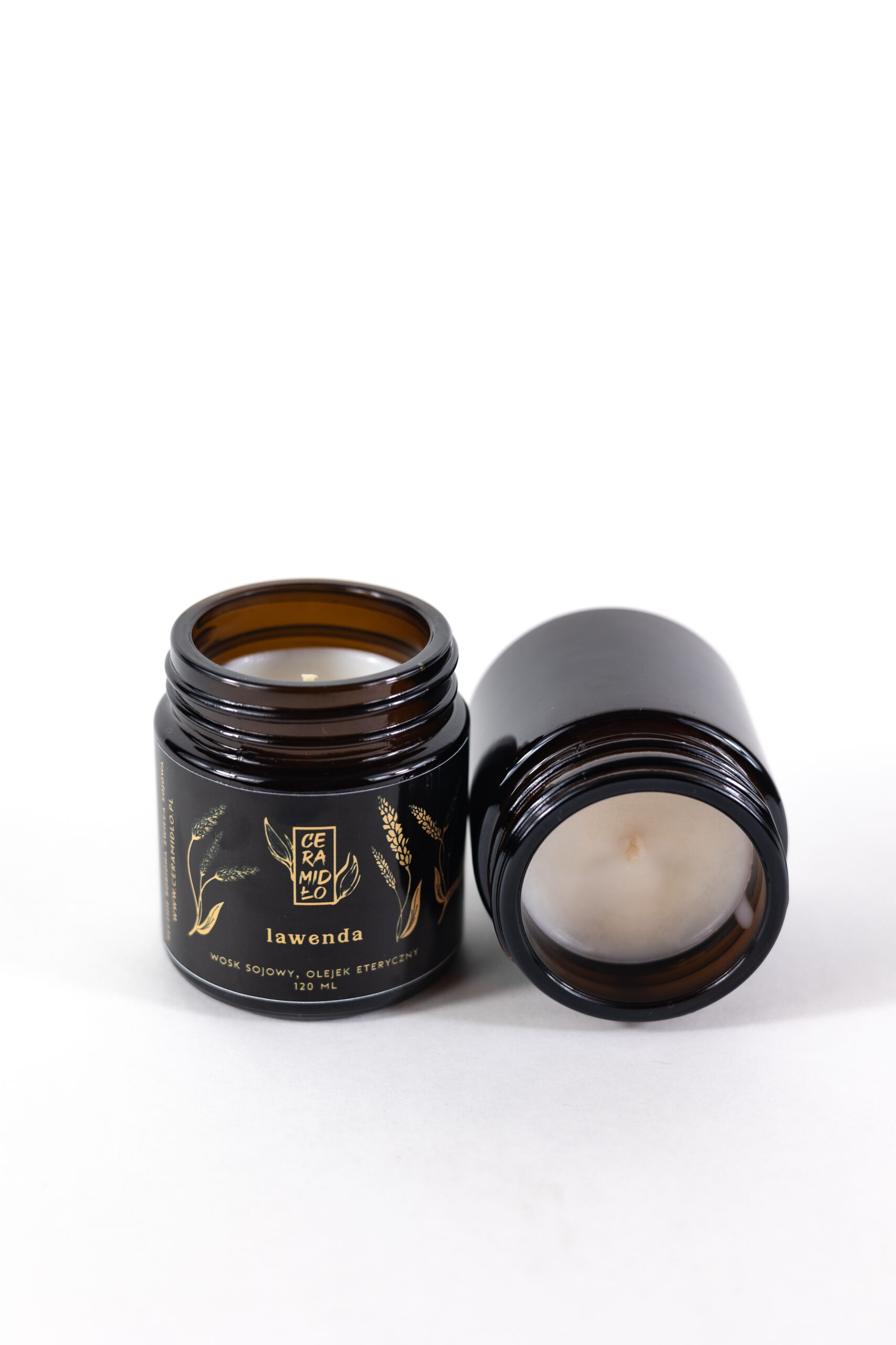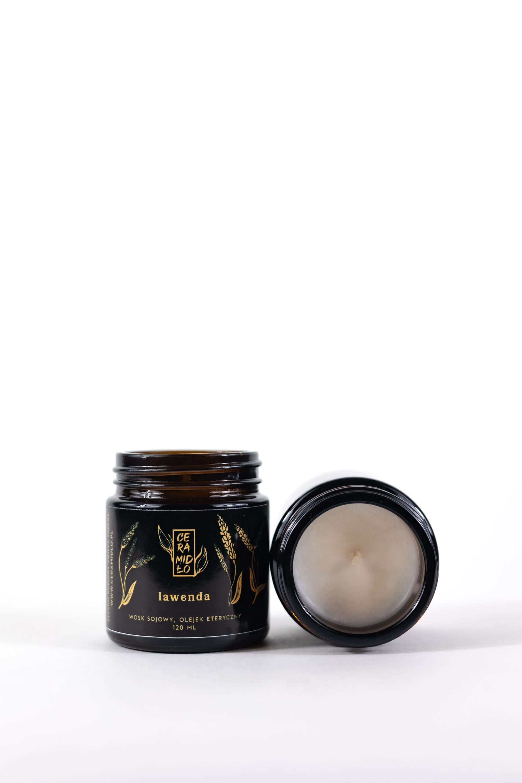 Ręcznie robiona świeca z wosku sojowego i eterycznego olejku lawendowego, w słoiczku z ciemnego szkła z plastikową zakrętką.