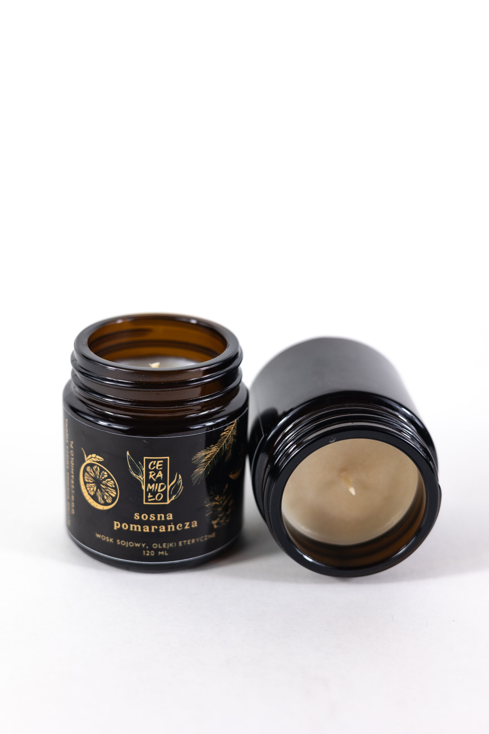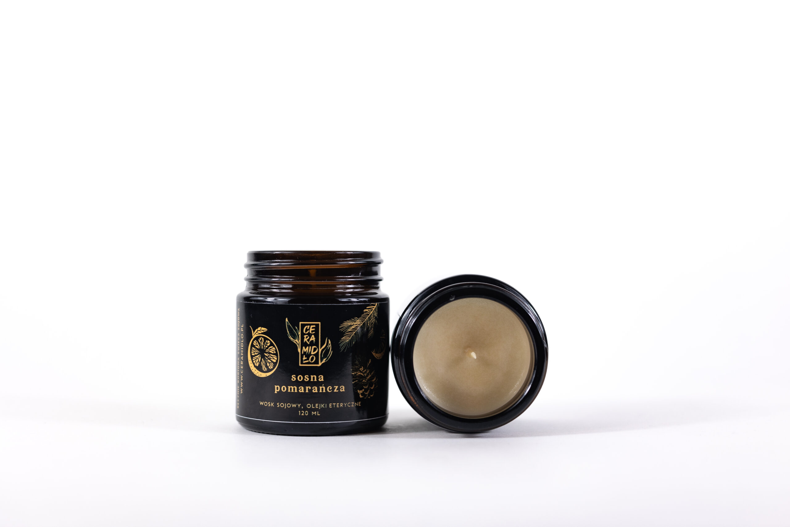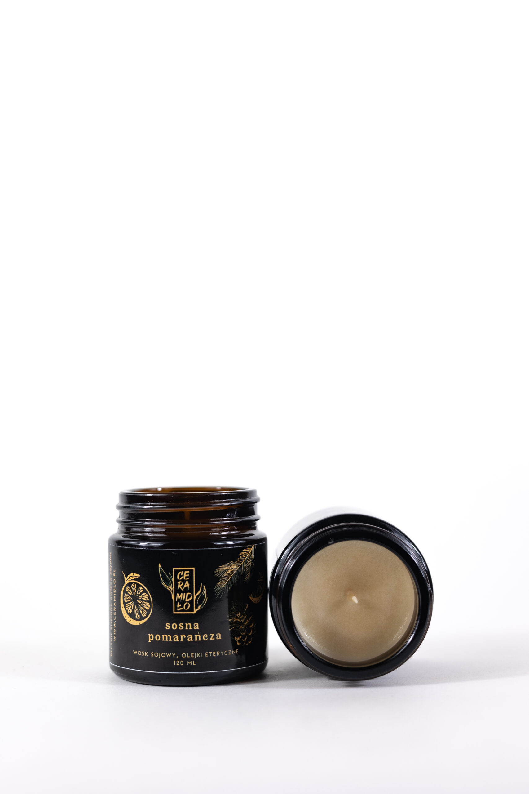 Ręcznie robiona świeca z wosku sojowego i eterycznego olejku z sosny i słodkiej pomarańczy, w słoiczku z ciemnego szkła z plastikową zakrętką.